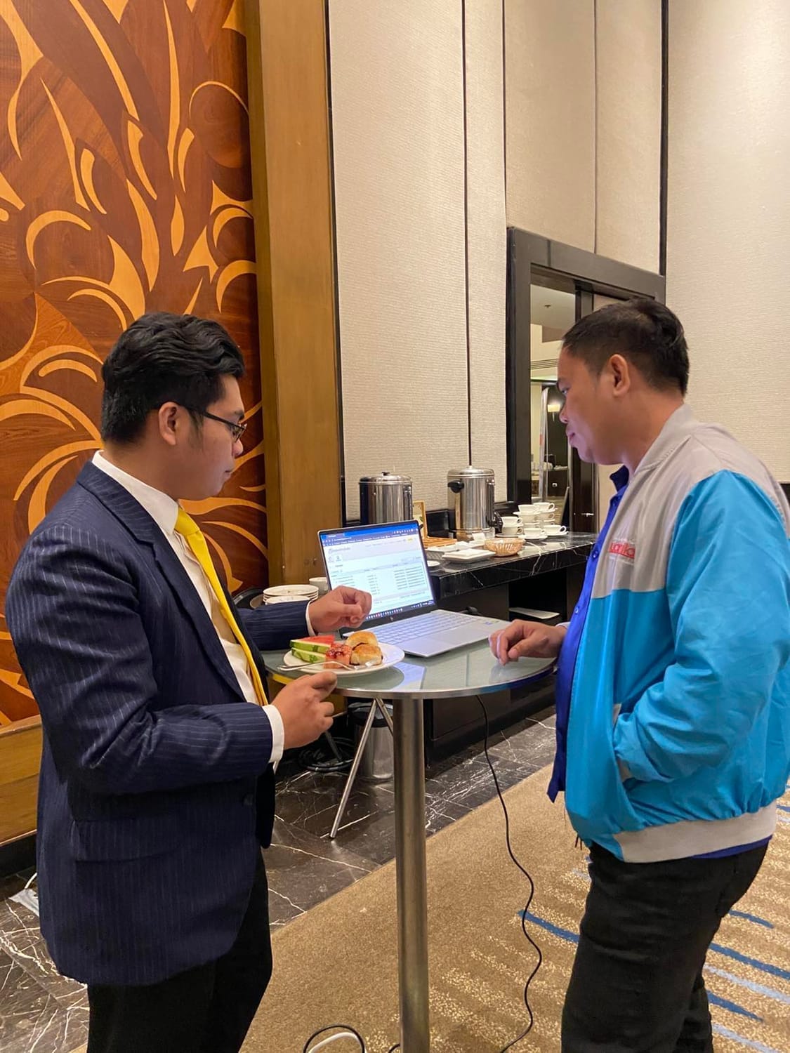 Mikhael Philip C. Quibral (left), CBSI Software Engineer, assists a guest in navigating AccountingSuite during the launch event.